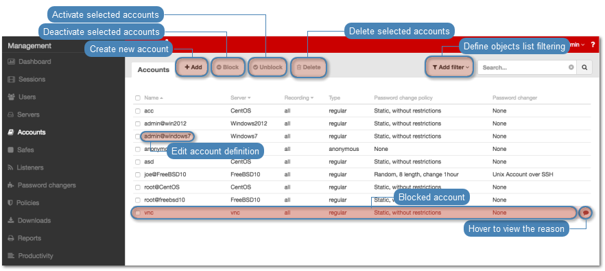 defines the privileged account existing on the monitored server. It specifies the actual login credentials, user authentication mode: anonymous (without user authentication), regular (with login credentials substitution) or forward (with login and password forwarding); password changing policy as well as the password changer itself.