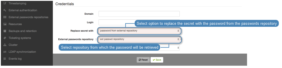 Define server’s object name and ERPM namespace in the External password repository sections.