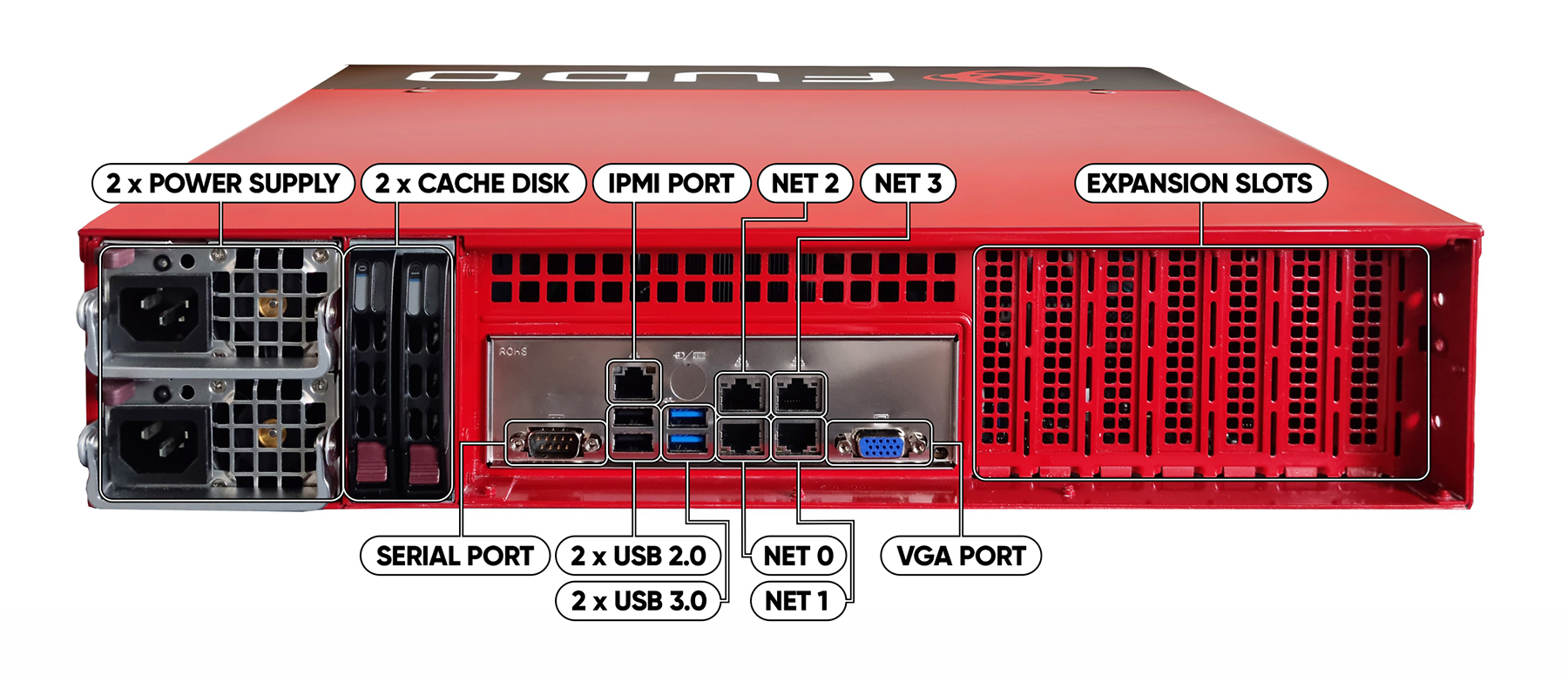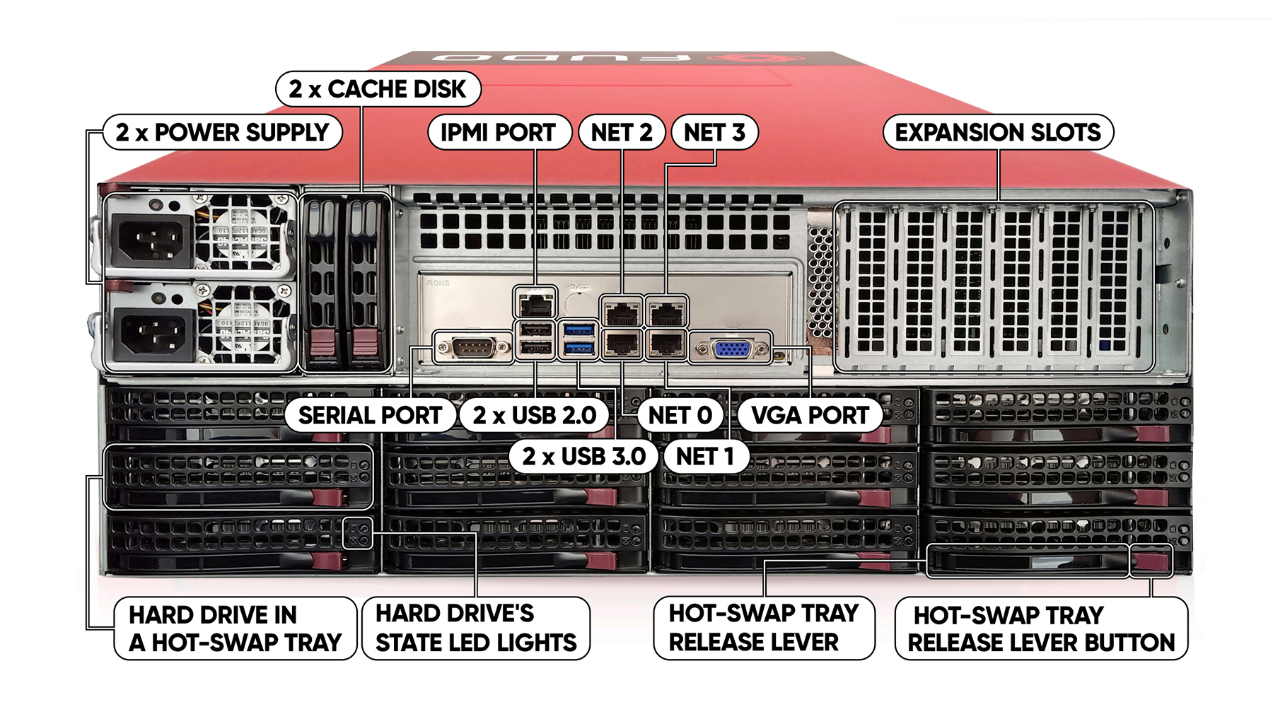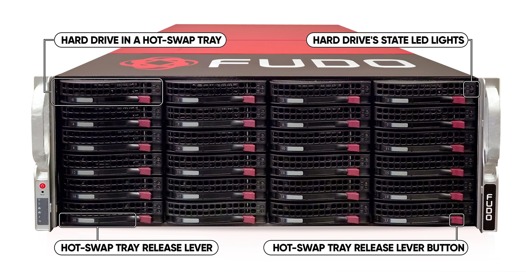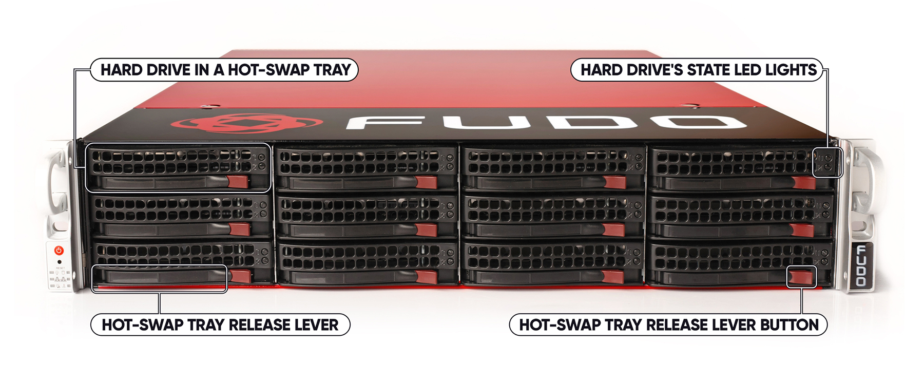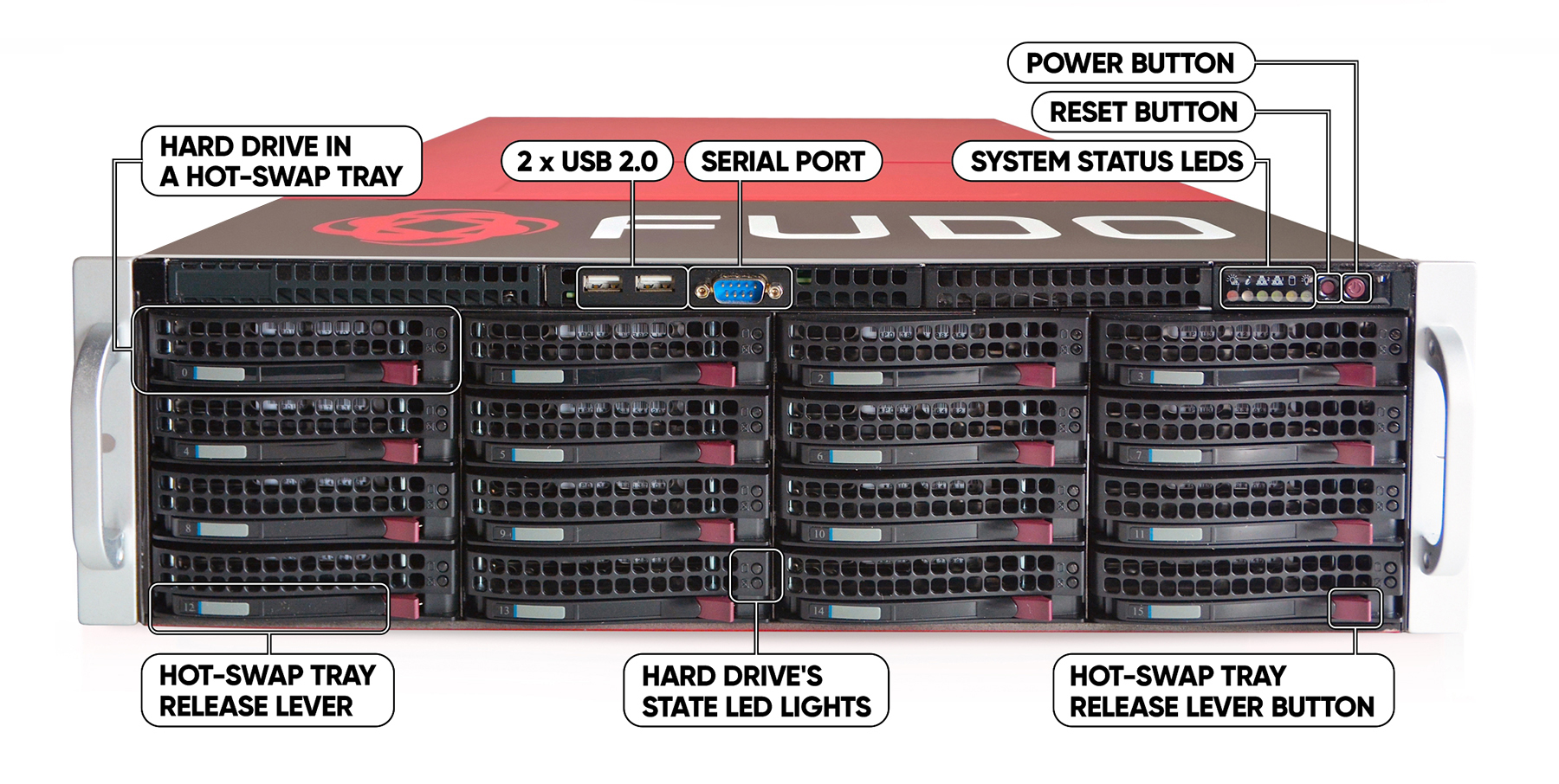 Fudo PAM is delivered in a 2U (F100x), 3U (F300x) or 4U (F500x) 19” rack server case.