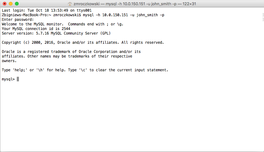mysql -h 10.0.150.151 -u john_smith -p, to connect to the database server. - Enter the user’s password.
