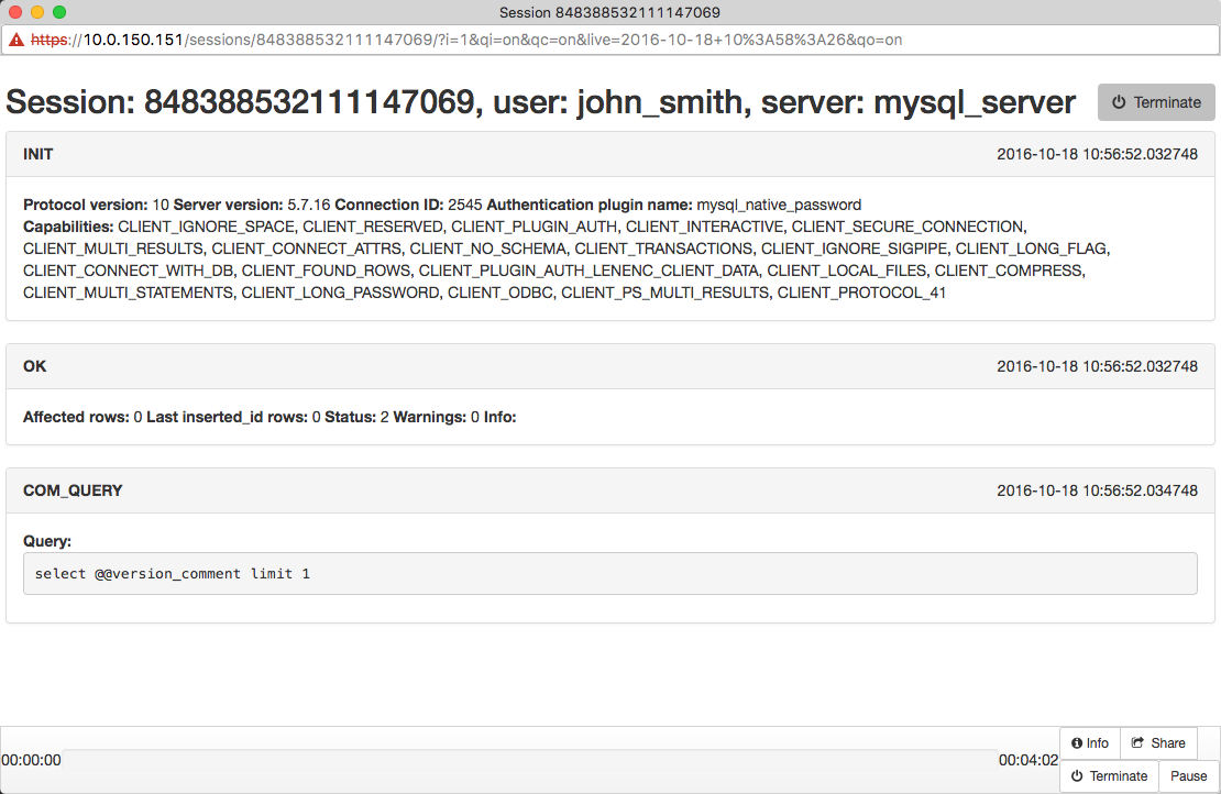 In this scenario, the user connects to a MySQL database using individual login and password. When establishing the connection with the remote server, Fudo PAM substitutes the login and the password with the previously defined values: root/password (authorization modes are described in the User authorization modes section).
